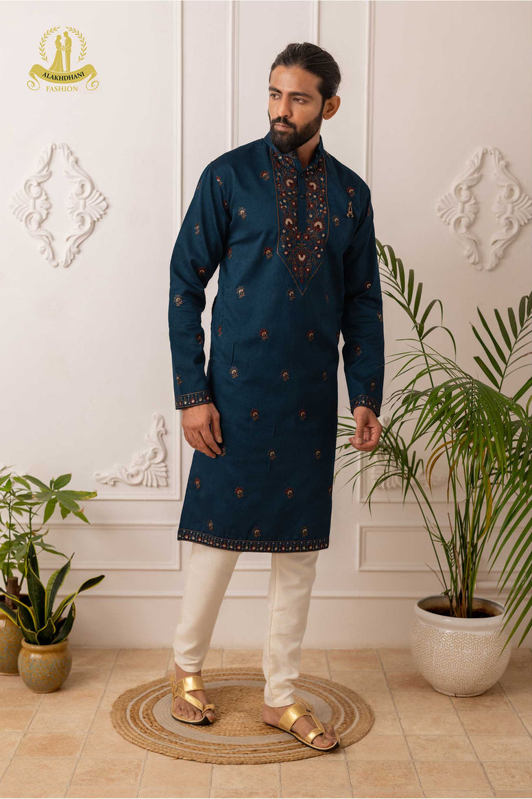 Elevate your wardrobe with the Mens Niyo Blue Kurta from Alakhdhani Fashion. Crafted with precision for the modern gentleman, this kurta combines traditional elegance with contemporary style. The exquisite blue hue and detailed stitching reflect our commitment to quality and customer satisfaction. Perfect for any festive or casual occasion, this kurta ensures you look effortlessly stylish. Trust Alakhdhani Fashion to deliver impeccable designs that blend comfort and sophistication seamlessly.